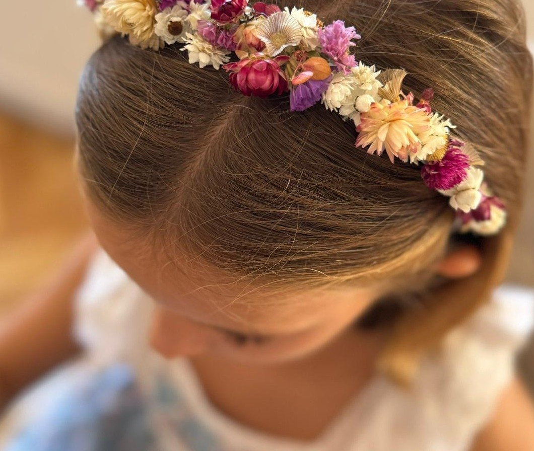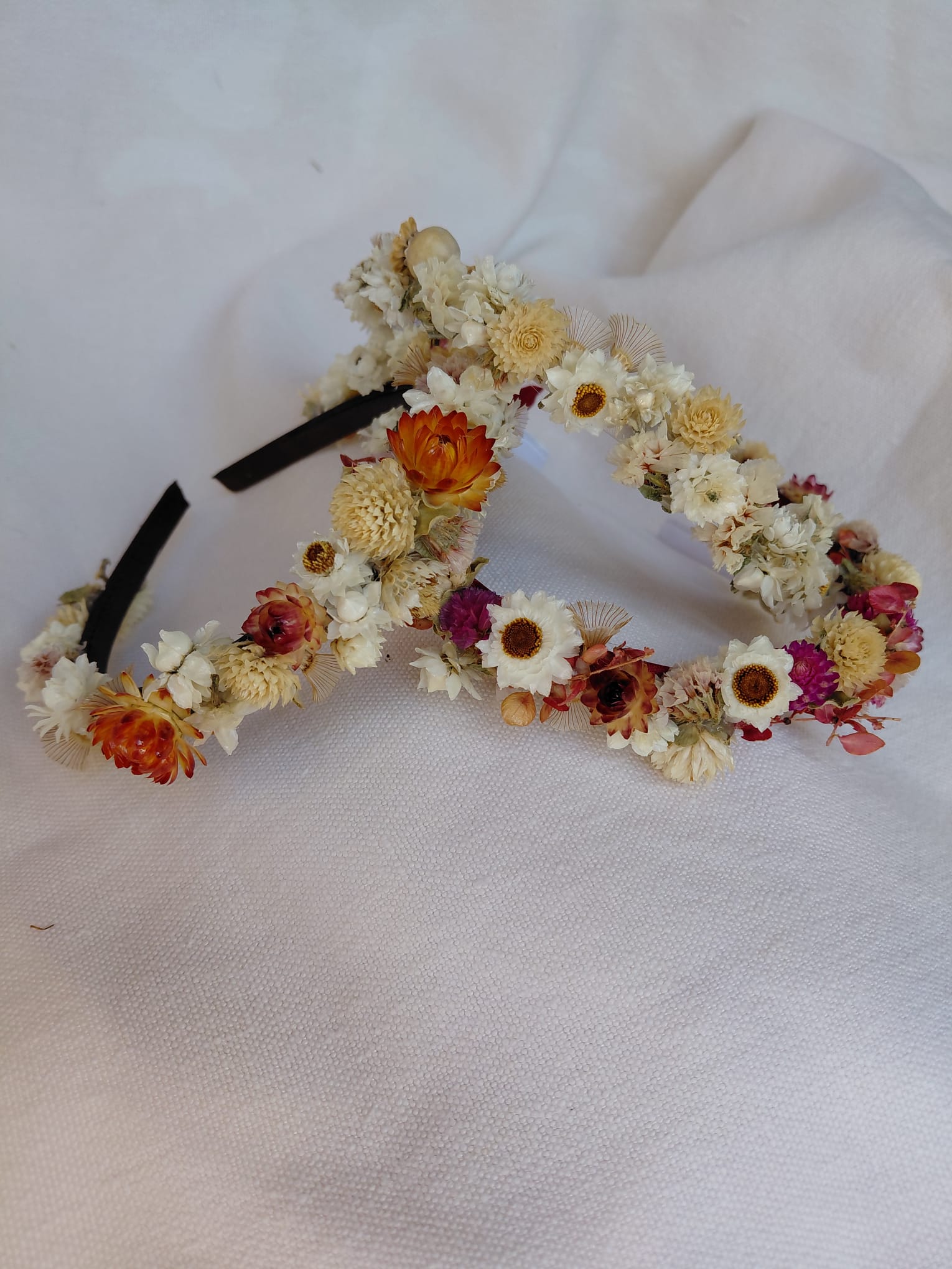Las diademas de flores secas de Alameda Blanca están hechas con flores frescas de temporada, cultivadas  en nuestra granja y preservadas de manera natural sin tintes.